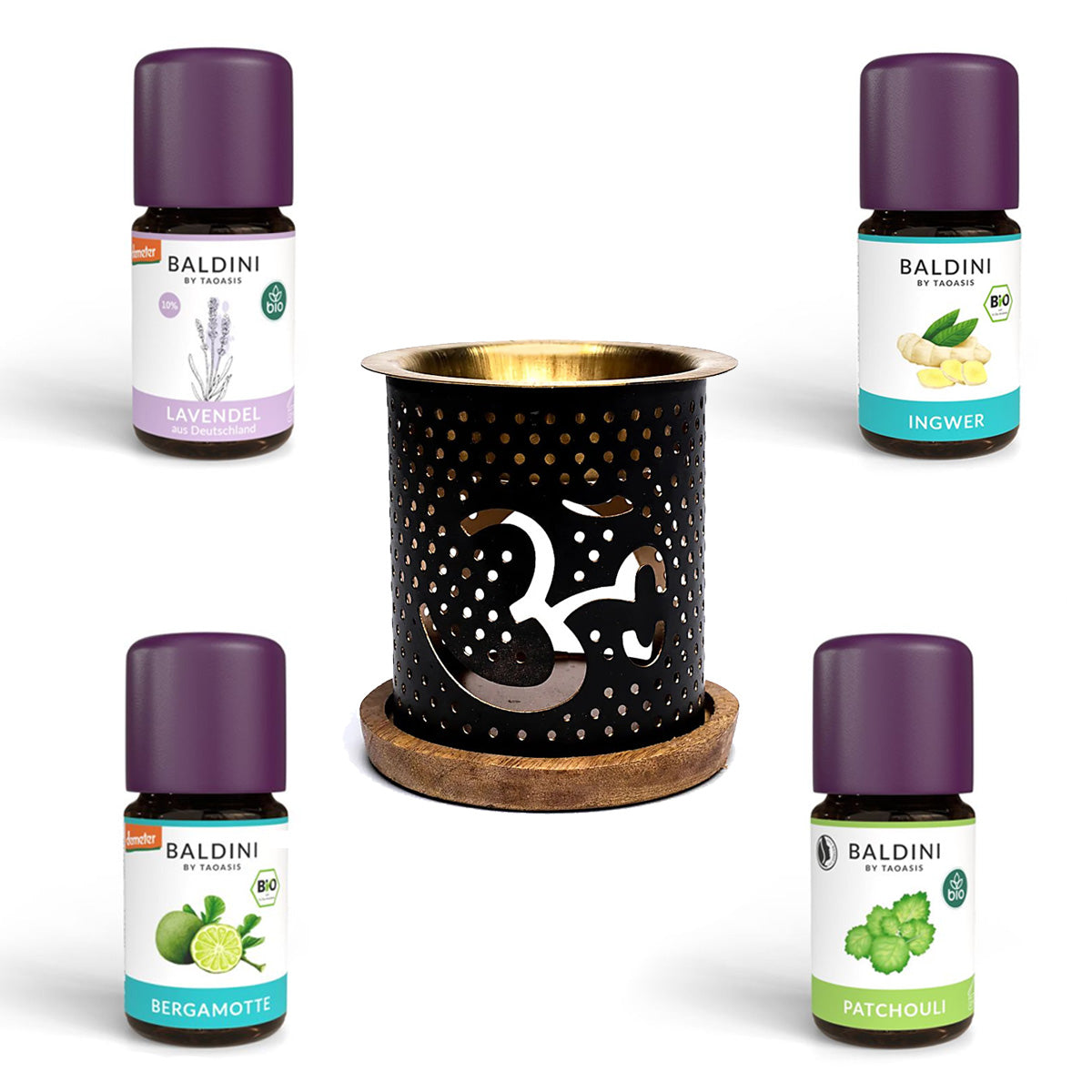 Aromafume Duftlampe OM aus Metall mit Holzuntersetzer inklusive Baldini Bio Ätherische Öle 4er Set (4x5ml). Für Aromatherapie mit Teelicht.